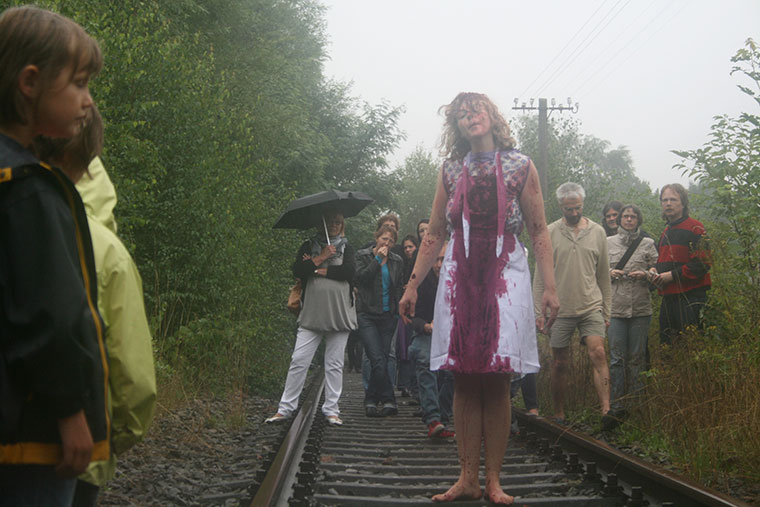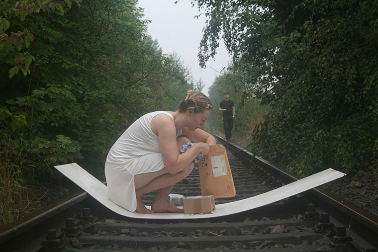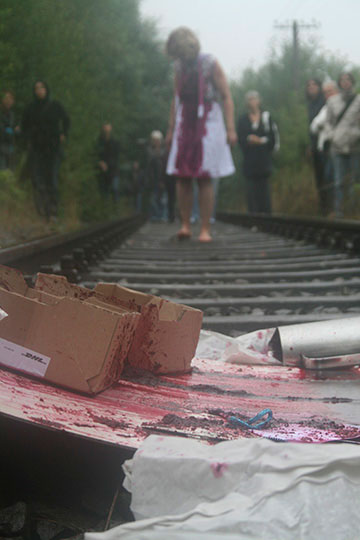 Objekte: frisch gepresster Saft aus Roter Beete, 2 Pakete, Schere, 1 langes weißes flexibles Brett, stillgelegte Gleise, 1 weiblicher Körper in einem weißen Kleid, Regen