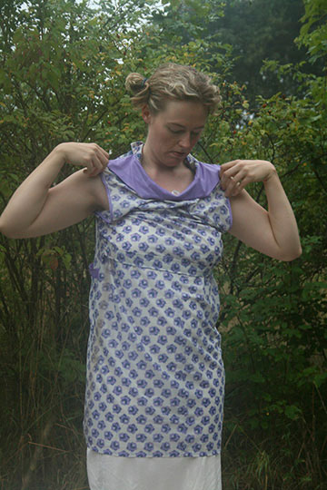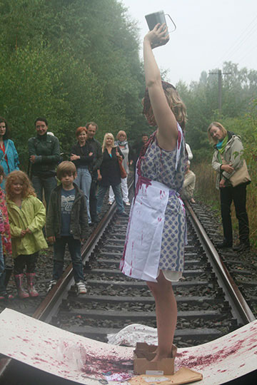 En este rito de paso, estoy de pie en una plataforma colocada sobre las vías. En el medio de la tabla blanca abro dos paquetes que contienen dos tipos diferentes de delantales de cocina. Me pongo uno de ellos correctamente y el otro al revés. Con un grito entre gritos y cantos, vierto jugo espeso de remolacha sobre mi cabeza y los delantales de cocina. El blanco se vuelve rojo. Comienza a llover. Intento llegar al otro lado de la tabla, pero fracaso porque está demasiado mojado. Camino hacia atrás a lo largo de las vías. Intento arreglarme el cabello, sin éxito. Salgo del espacio.