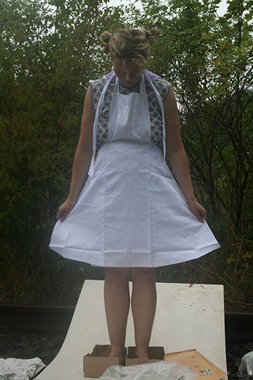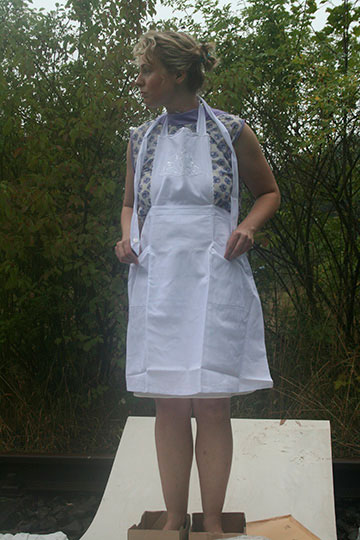 In this rite of passage I am standing on a platform placed over tracks. In the middle of the white board I open two parcels which contain two different kinds of kitchen aprons. I put one of them on the right way and the other one the wrong way.