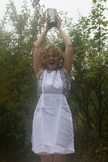 With a scream in between shouting and singing, I pour thick beetroot juice over my head and the kitchen aprons. The white changes to red. It starts to rain.